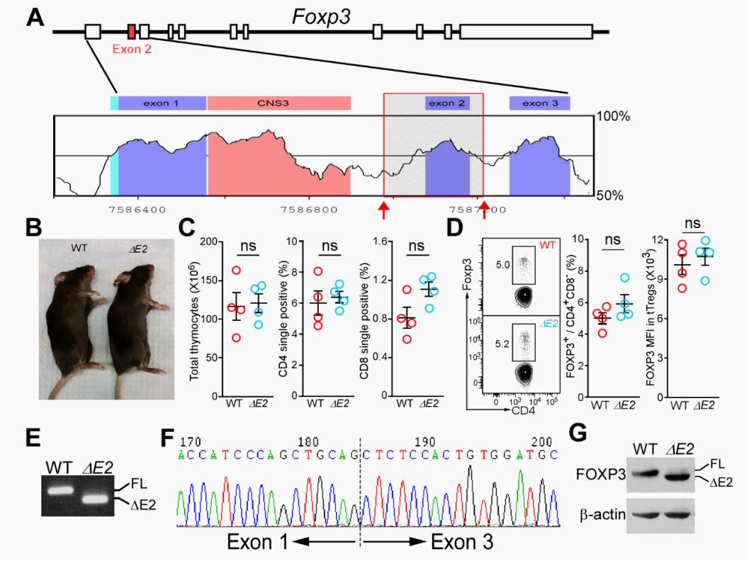 Human FOXP3 encodes two major isoforms regulated by alternative splicing: a full-length isoform and an isoform lacking exon 2 (FOXP3 ΔE2). How these isoforms differ in regulating Treg function is not well understood. Du et al. generated a mouse model in which Tregs express only FOXP3 ΔE2 and identified that these mice developed systemic autoimmunity featuring anti-dsDNA autoantibodies and immune complex glomerulonephritis, caused by exacerbated TFH and germinal center responses. Expression of the FOXP3 ΔE2 isoform resulted in Treg instability, increased expression of inflammatory cytokines, and down-regulation of positive regulators of Foxp3. Furthermore, human patients who expressed only the FOXP3 ΔE2 isoform developed immune dysregulation, polyendocrinopathy, enteropathy, X-linked (IPEX) syndrome. These results identify FOXP3 exon 2 as a critical regulator of Treg function.